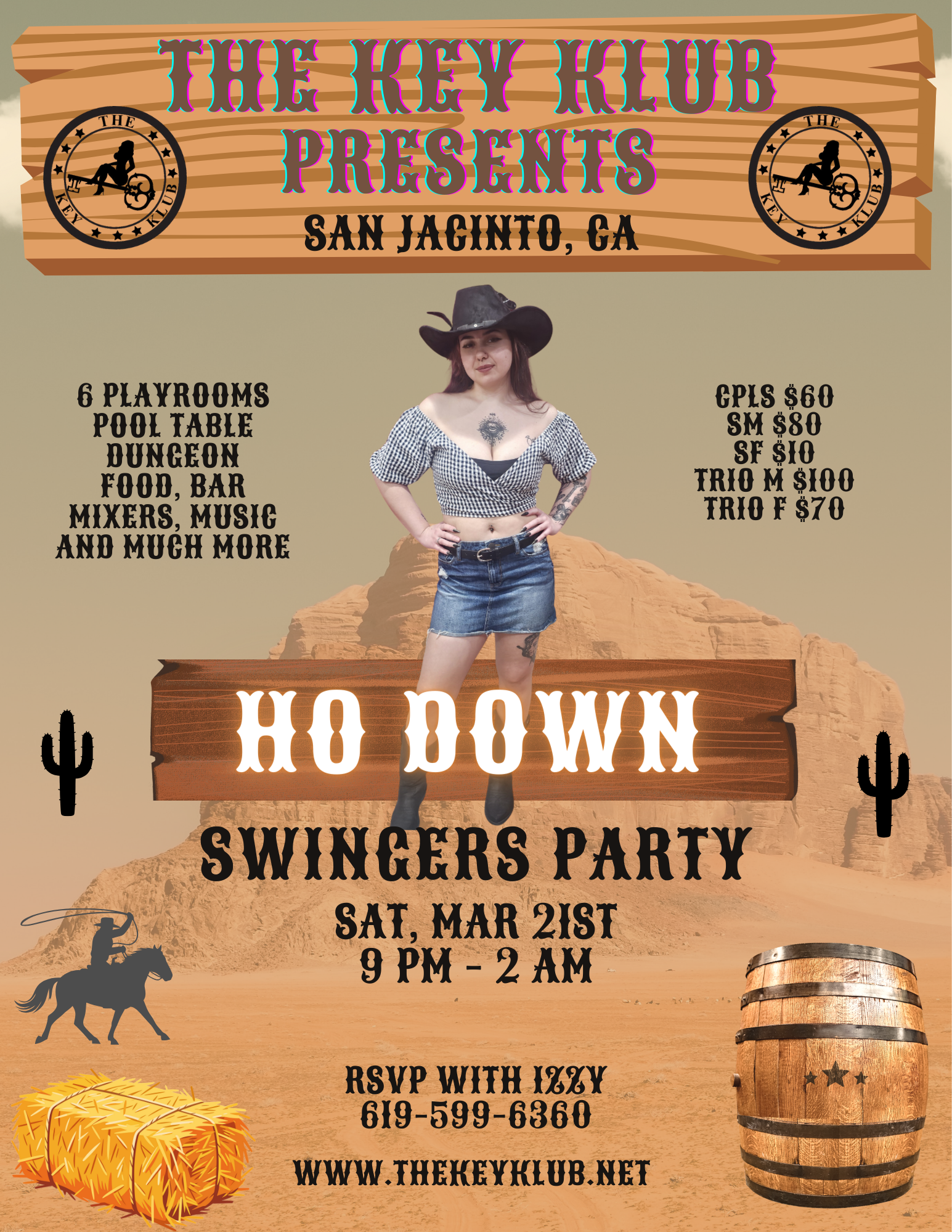 Save a Horse, Ride a Cowboy. Ride ’em hard ladies! Dress in the them or dress to impress. 6 playrooms, 3 bathrooms, pool table, dungeon, jacuzzi, smoking area, 420 friendly, full dinner, dessert, mixers, bar, music, plenty of parking and lots more. Not everyone attending are coming from this site.
